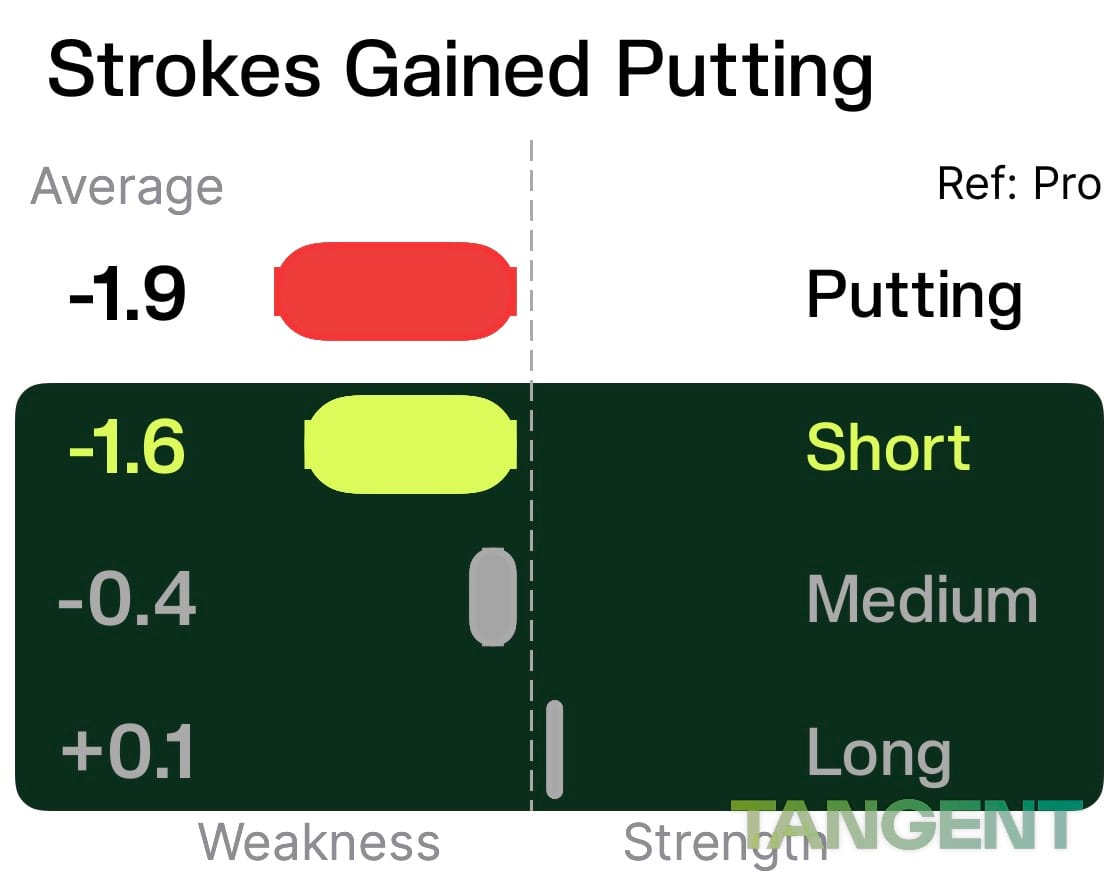 It is rare to see professional golfers 3 putt from short distances, much less multiple times. Tangent breaks down his putting performance by distance and highlights short putts as the key area of focus. Short putts include those from 4-6ft.