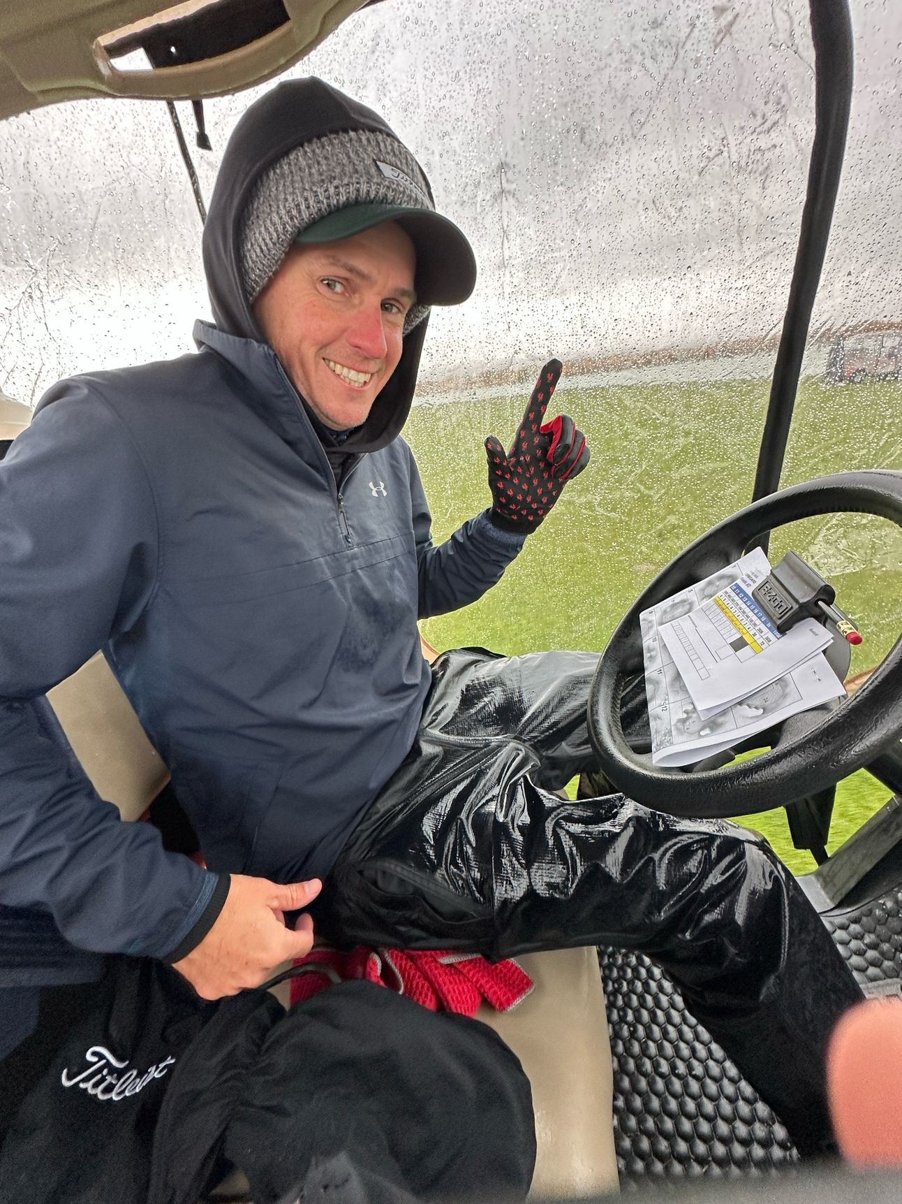 I had multiple glove options. Titleist mittens that I could put over my hands between shots to keep them warm, but the real winners were the red and black rain gloves you see on my hands from Red Rooster Golf. I keep these rain gloves in my bag just in case and they serve double duty.