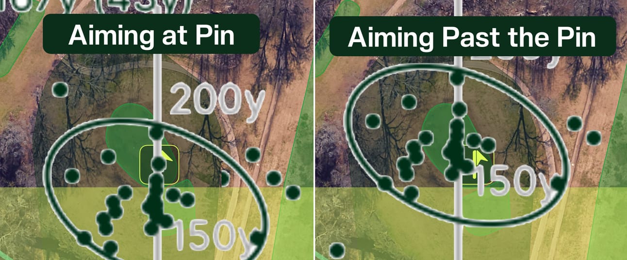 Just take a look at this example below with a front pin. If you use the pin distance as your target, almost 75% of the shot distribution is short of the green. Contrast that with the right image where the aim point is biased 10 yards past the pin and slightly left (towards the center). All of the sudden most of the shots are on the GREEN and few are short.