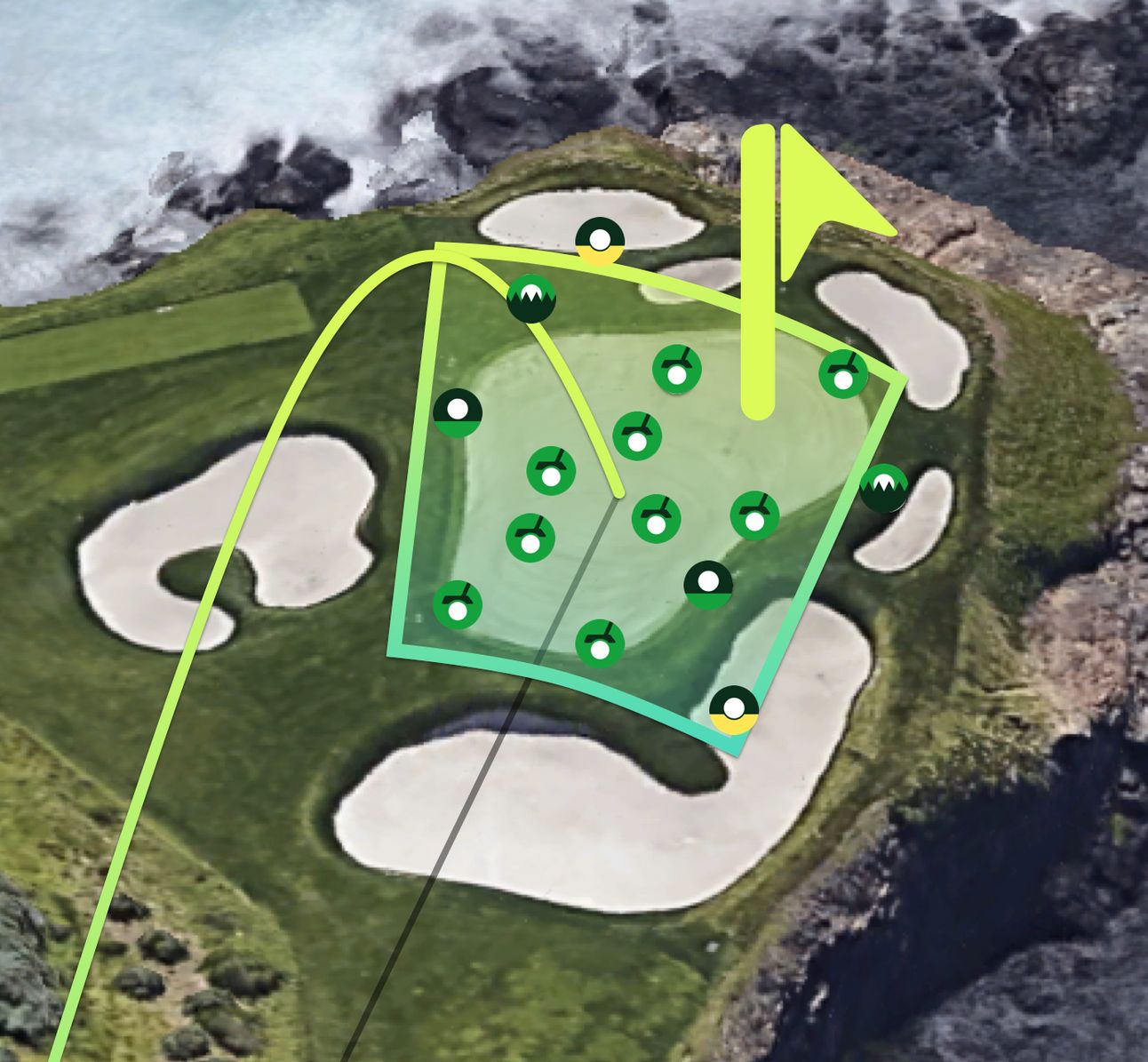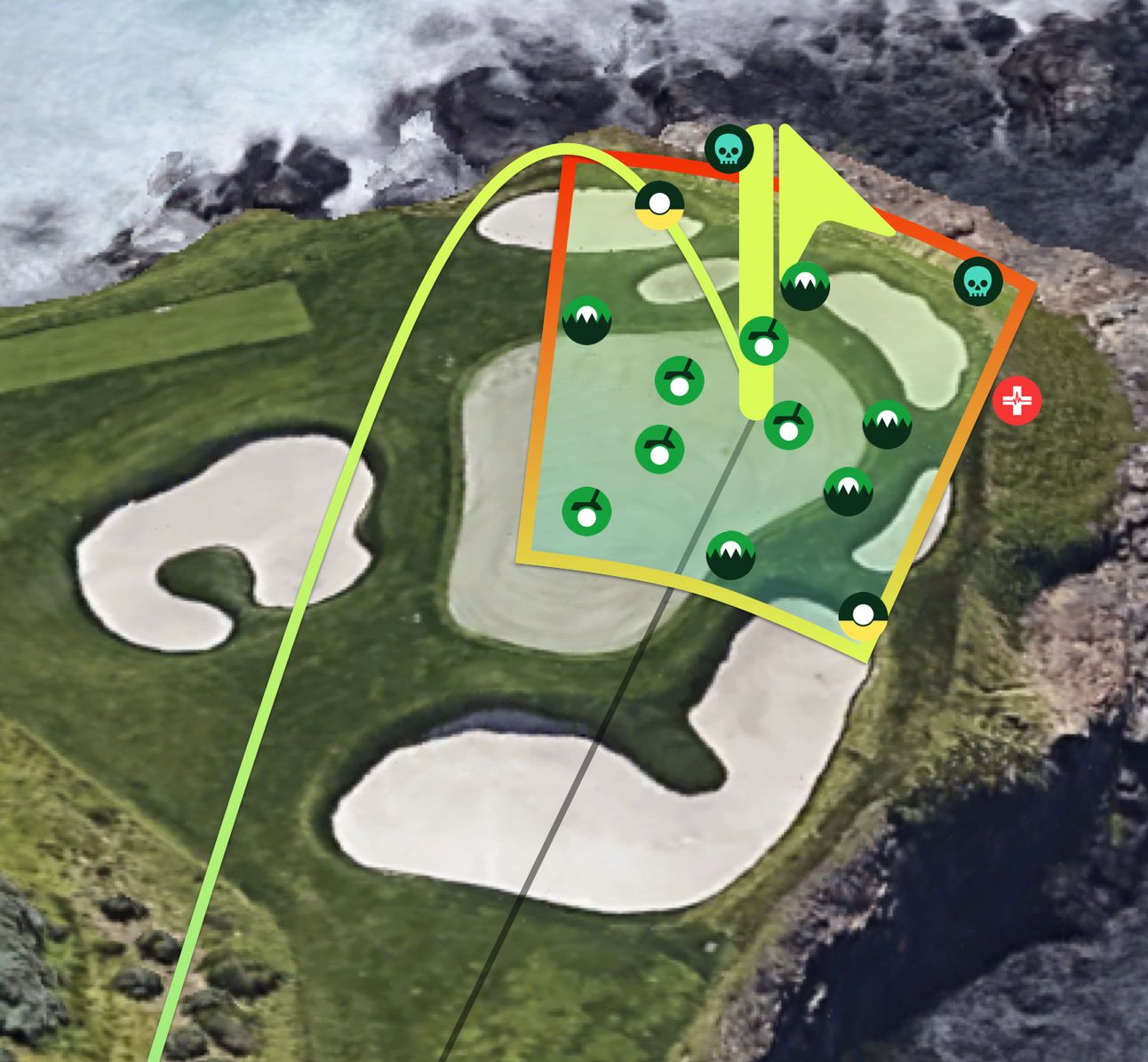 Better players tend to have tighter dispersions which means they can choose more aggressive targets. Speaking of which, I used the 7th at Pebble for this example and even the best in the world can’t go pin seeking here. That green is so ridiculously small that it doesn’t make sense and missing it could be catastrophic. Front middle of the green is a good place to start.