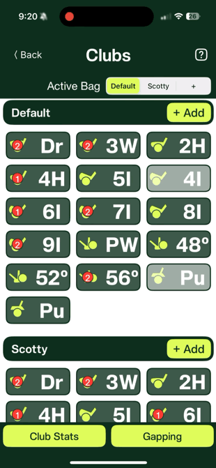 Simply hit the ‘+’ button under Active bags to add a new club to a new bag:
