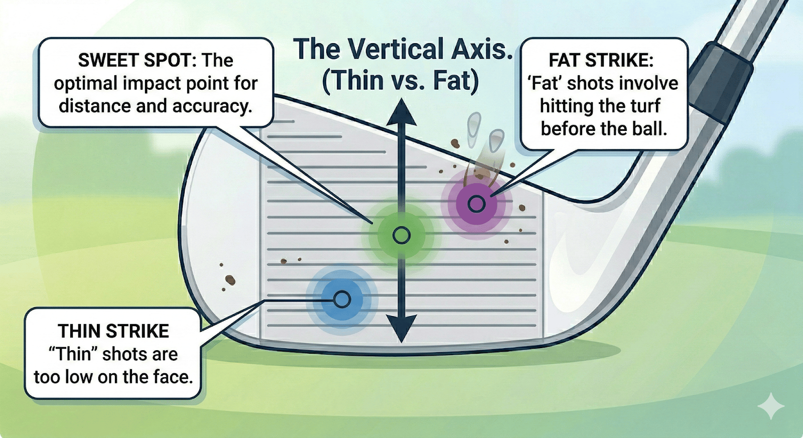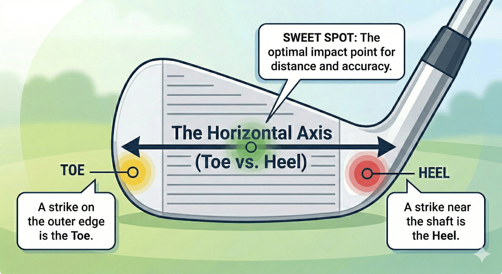 Golf impact location is the specific point on the clubface where the ball makes contact during a swing. It is measured on a two-dimensional grid: toe-to-heel (horizontal) and high-to-low (vertical). The center of this grid — the sweet spot — produces maximum energy transfer and ball speed. Off-center contact reduces distance and distorts direction through the gear effect.