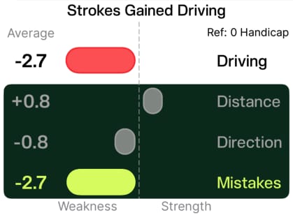 Mistakes (-2.7): Most of your strokes lost in driving come from mistakes (e.g., penalty shots, out-of-bounds, or poor lies). This is your biggest area to improve in driving.