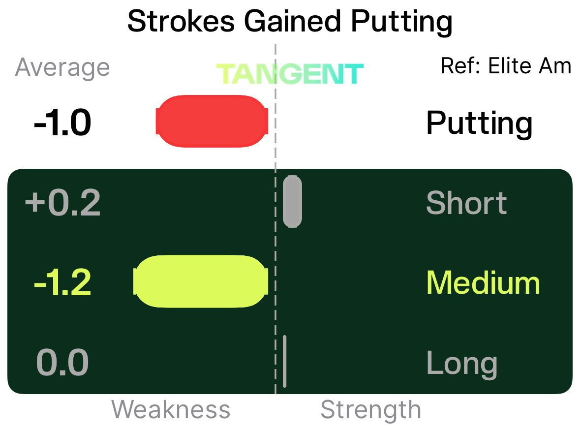 Referencing the above graphic from the Player Report in the TANGENT Golf app, I lost 0.8 strokes putting to an Elite Amateur in my last 20 rounds. So putting is certainly not a strength towards my goal, but not a disaster either. I should definitely spend most of my time working on my biggest weakness of Approach shots, there’s some opportunity to improve putting.