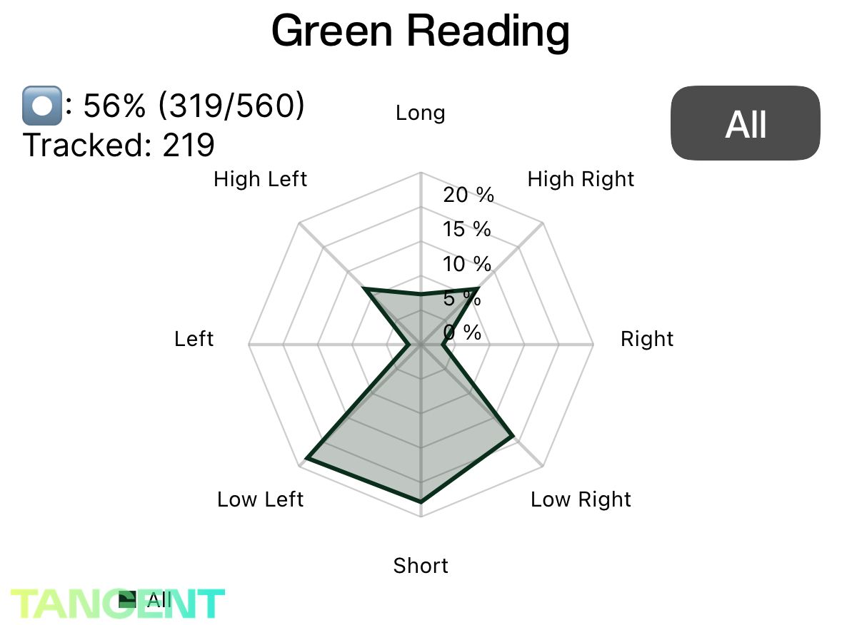 Now I know I need to work on medium length putts and that my tendency is to miss overwhelmingly low and short! I tend to under read the break and not hit them hard enough. Thats something I can take directly to my practice doing the Circle Drill or other Drills in the TANGENT app.