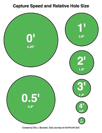 Okay, so you have to read the green perfectly as well. Any error in your green reading reduces the margin of error for the putt. Miss the ‘correct’ start line for the pace of your putt by half an inch on your read… Well now you have more like 0.4° of tolerance for your start line. We haven’t even factored in the difference in speed from one putt to the next.